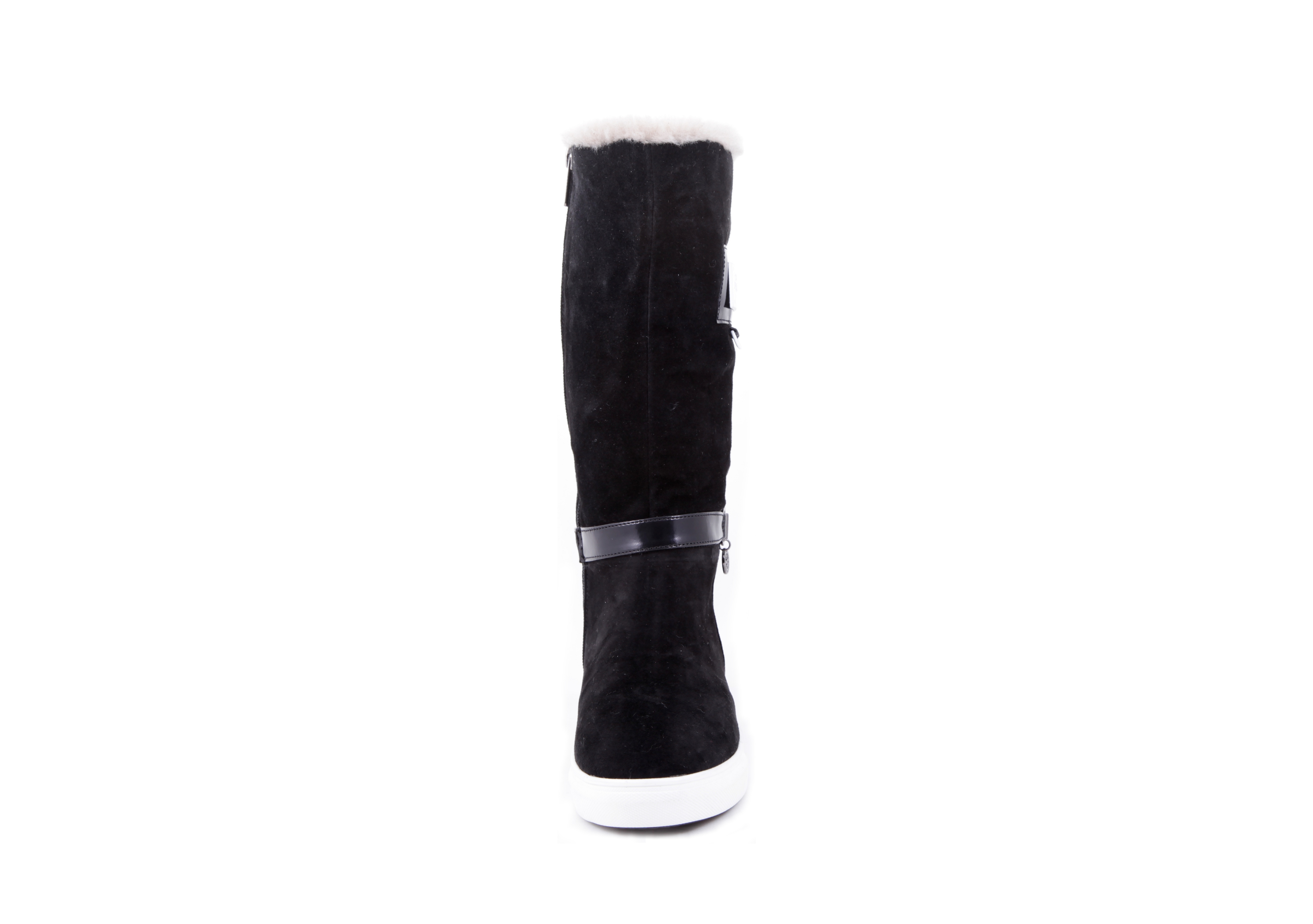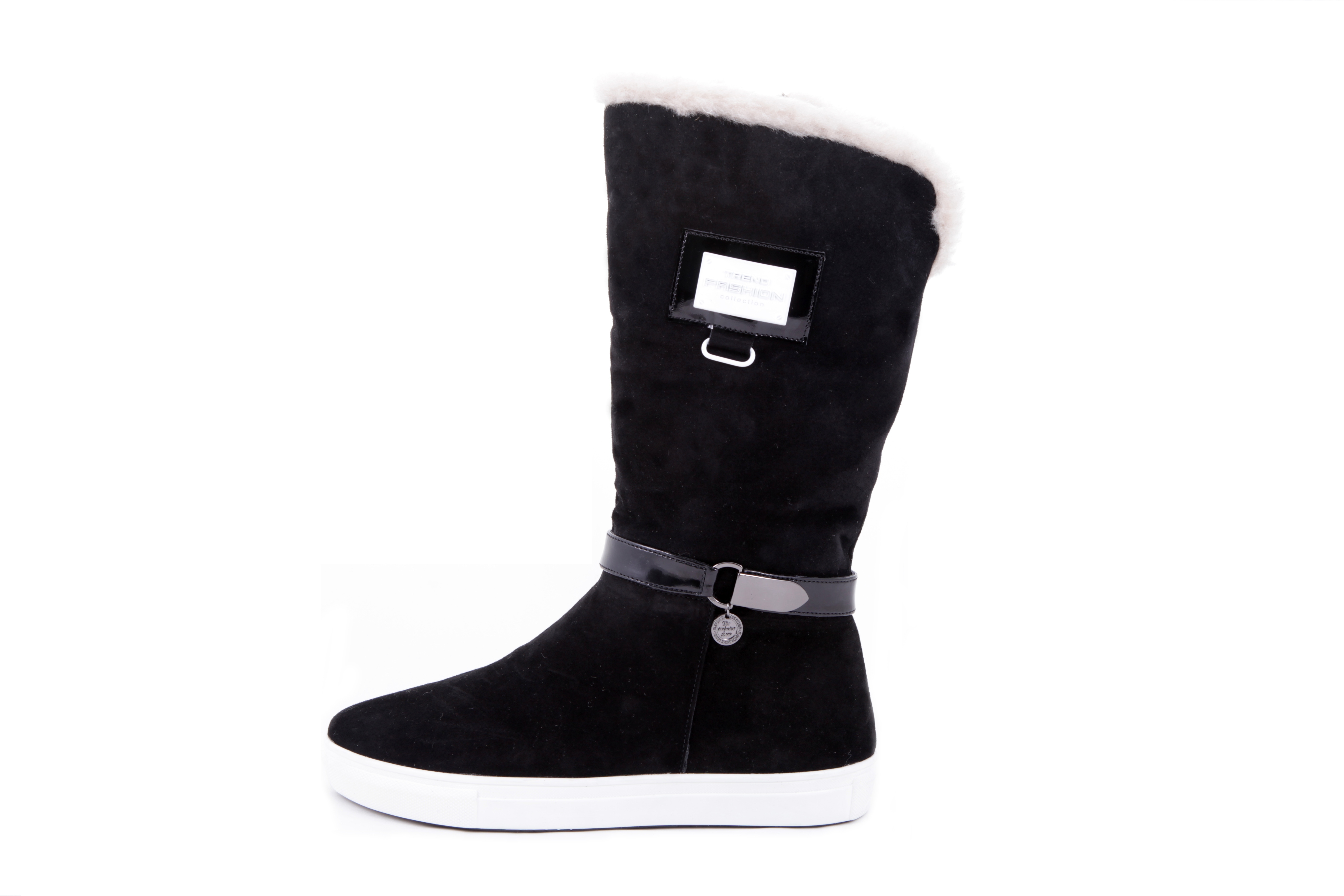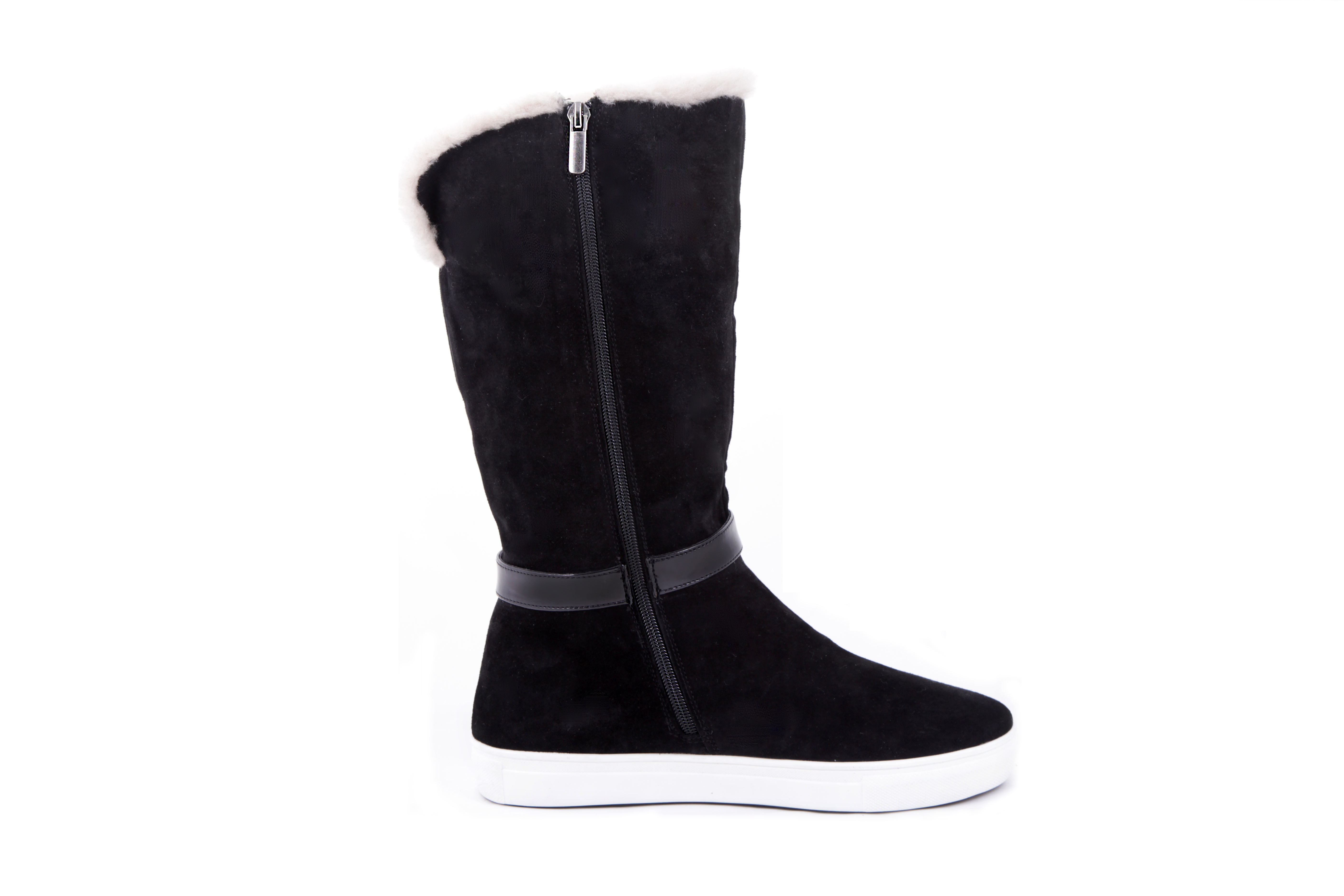 Зимние замшевые сапоги прекрасный вариант на морозную, зимнюю погоду. Уютные и очень удобные - они станут для Вас просто незаменимыми. Верх модели выполнен из натуральной замши классического черного цвета. Декоративный ремешок и металлическая фурнитура украшают это изделие. Сапоги застегиваются на молнию по всей длине голенища. Внутри подкладка натуральный мех обеспечит тепло в течении долгого времени. Сочетание черного замша с белой подошвой привлекают внимание своим необычным дизайном. Данная модель подойдет для повседневной носки.