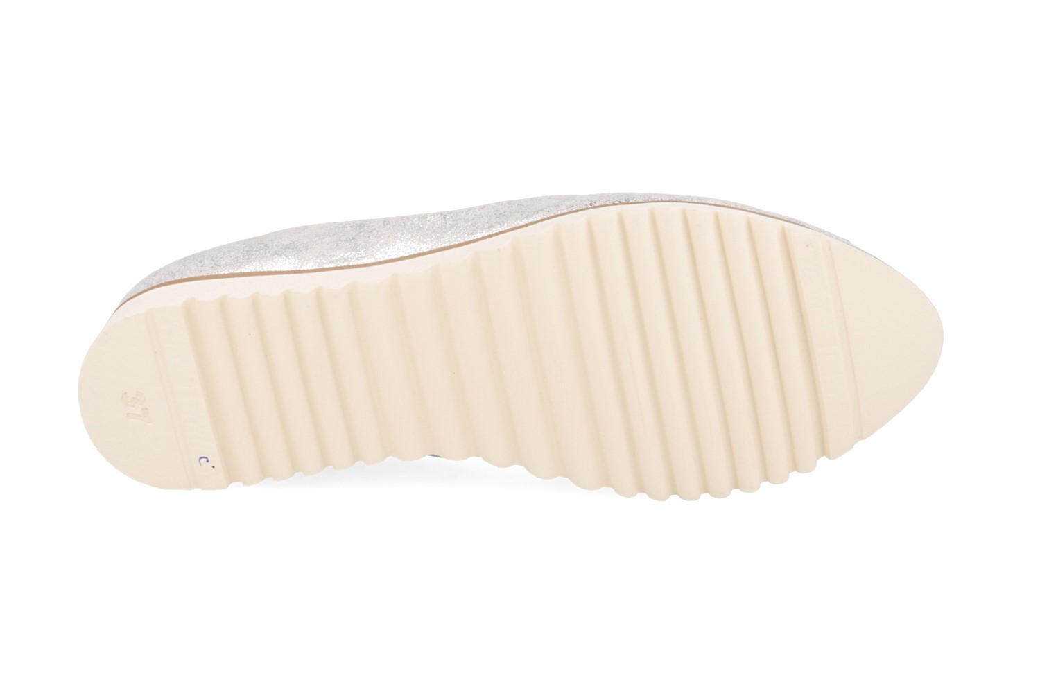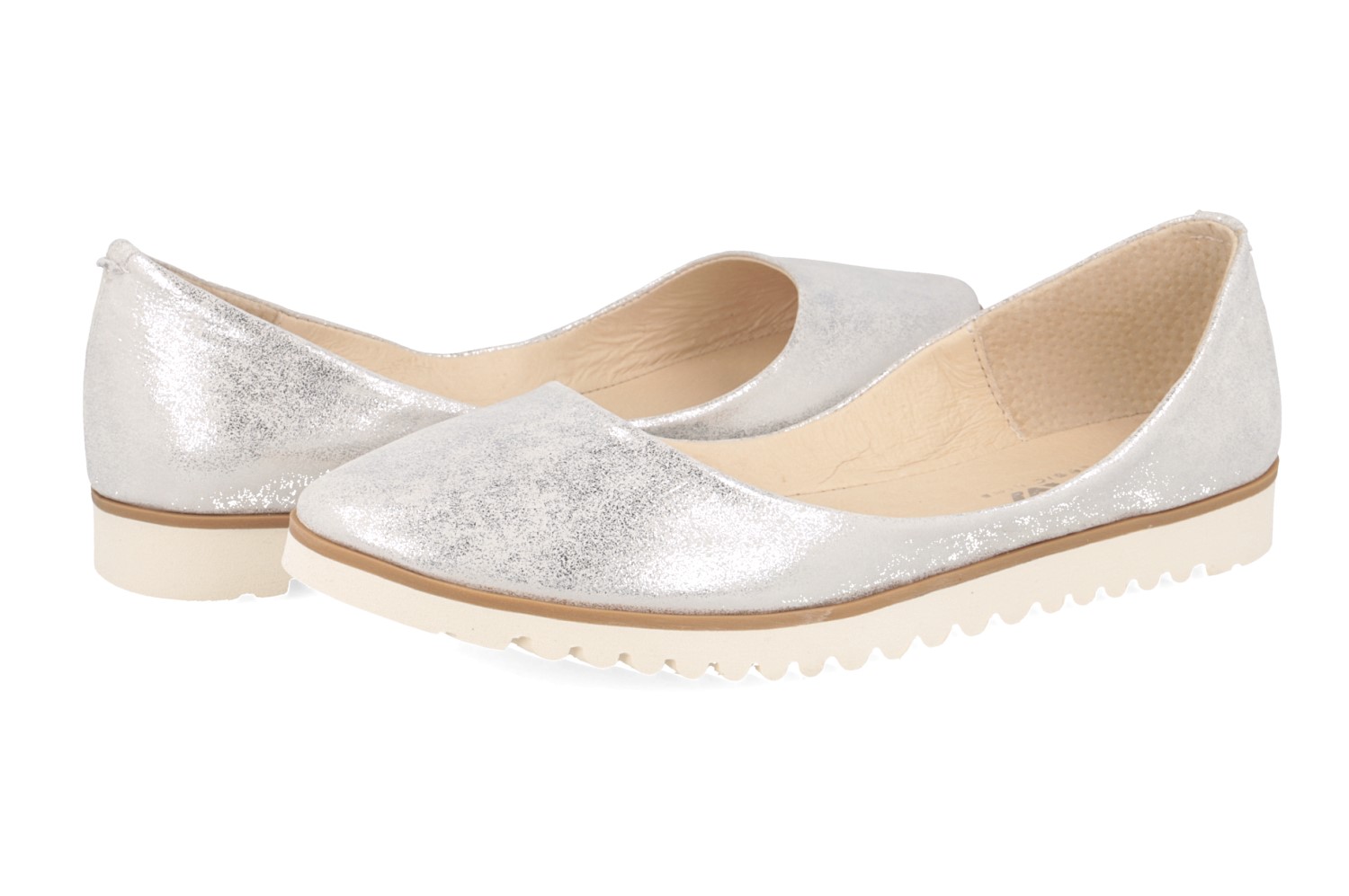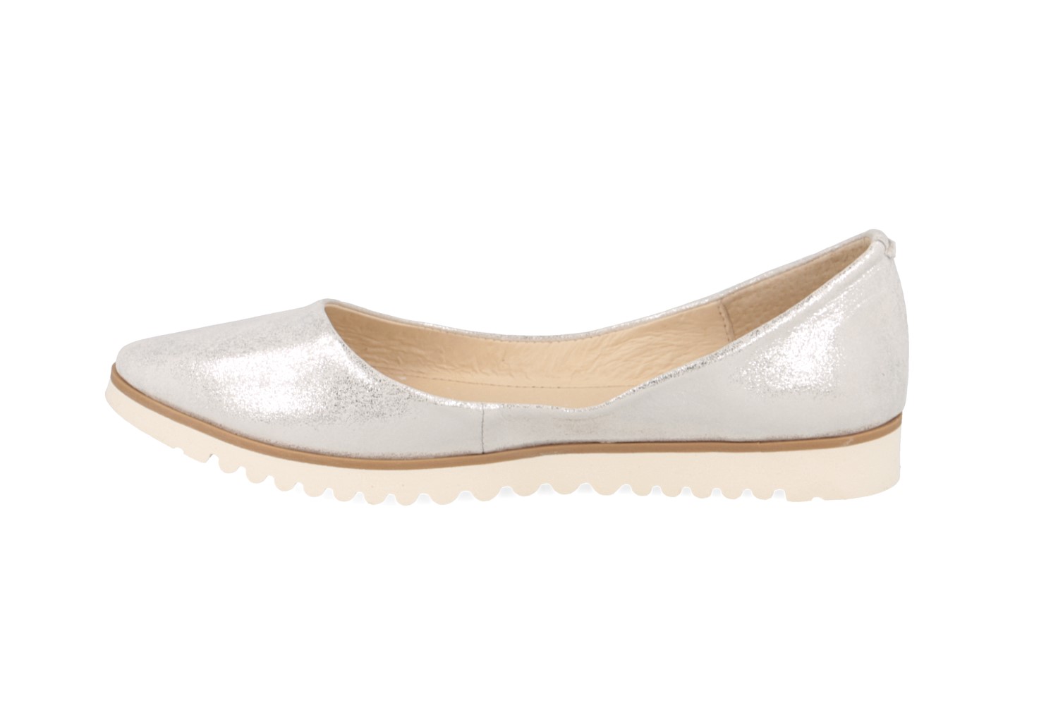 Стильные балетки на плоской подошве. Верх модели выполнен из натуральной кожи серебристого цвета. Блестящее покрытие придает Детальніше