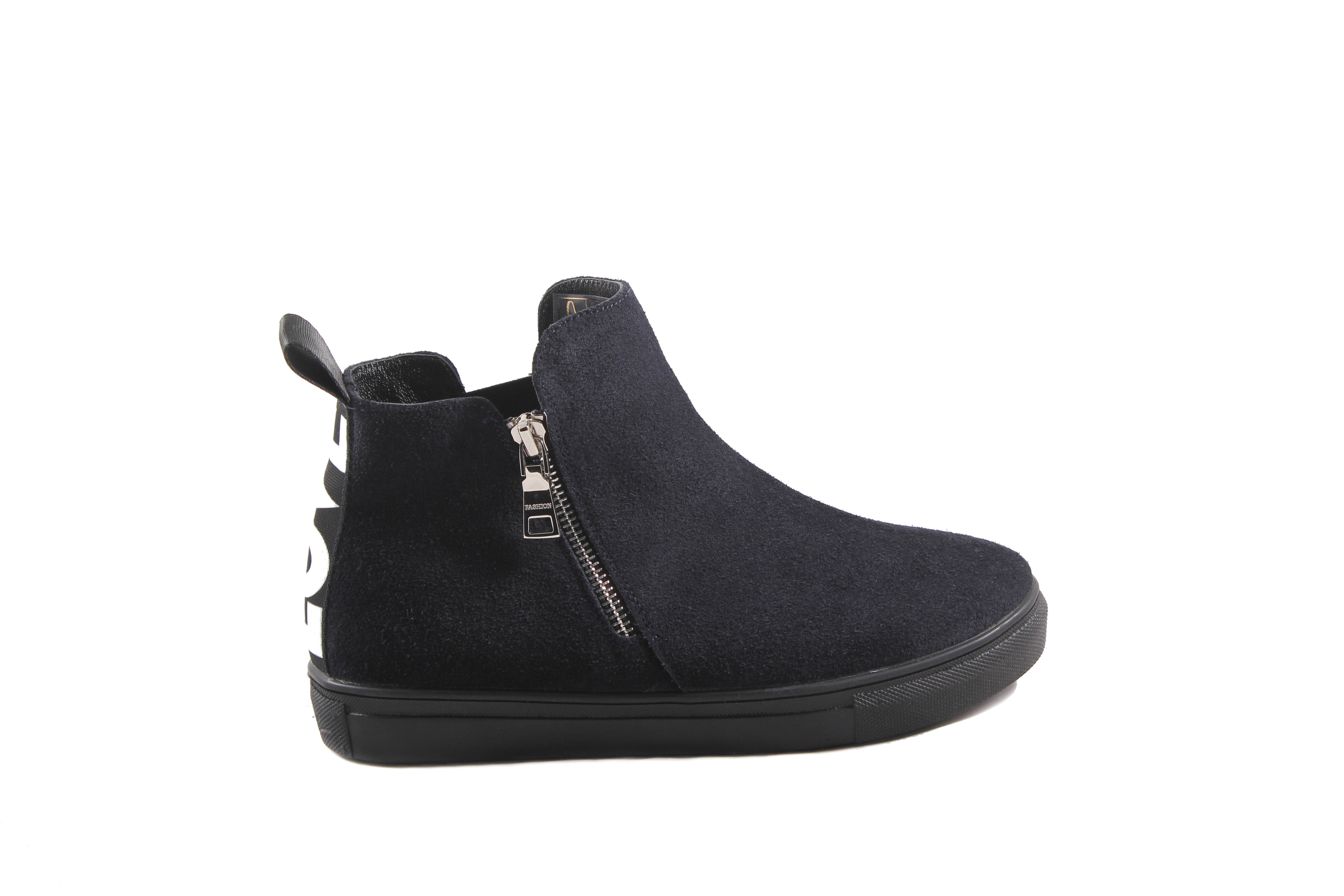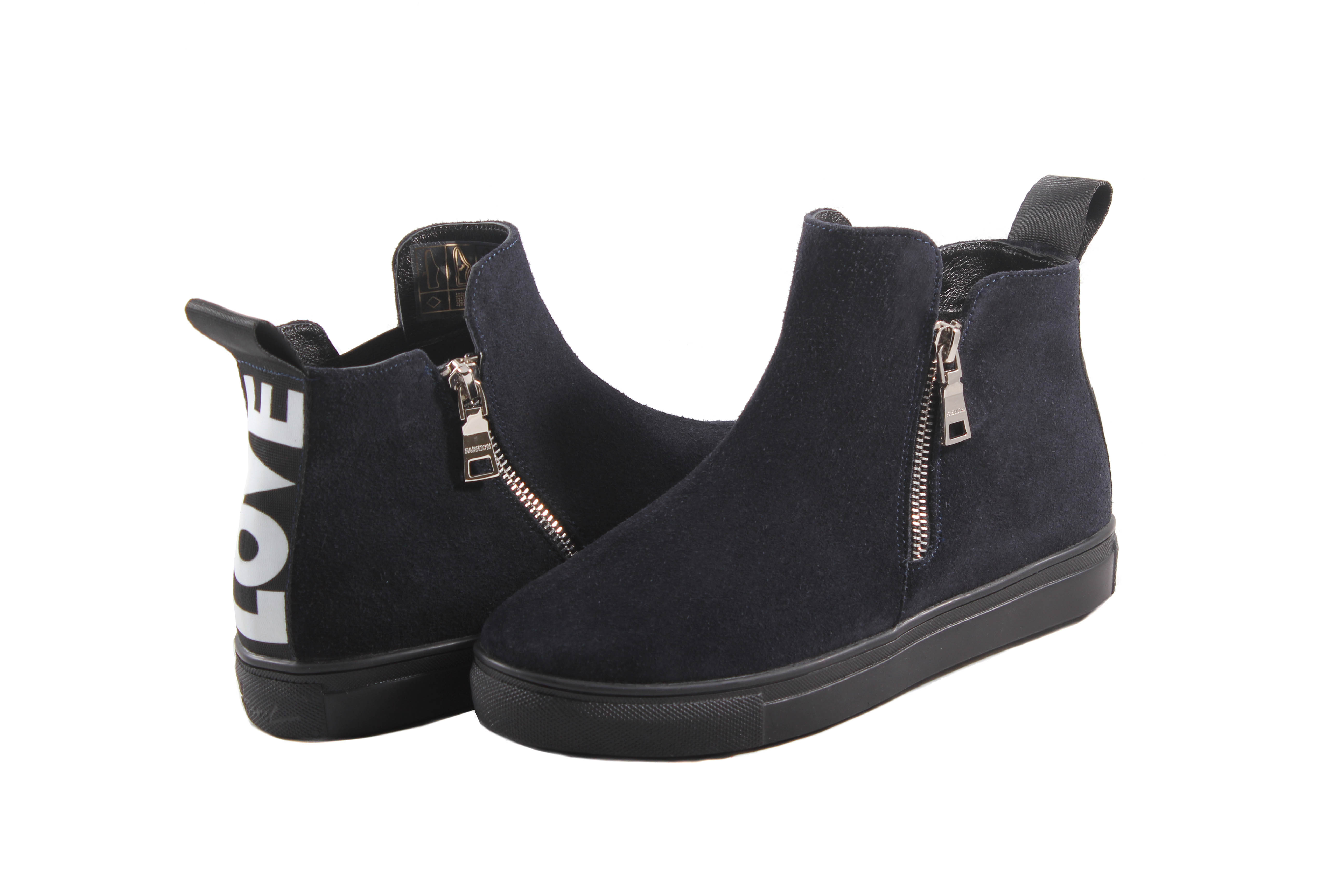 Удобные ботинки из натуральной замшевой кожи синего цвета. Минимум декора, вставка из прорезиненной ткани и змейка, плоский ход - эта пара просто незаменима для осени.