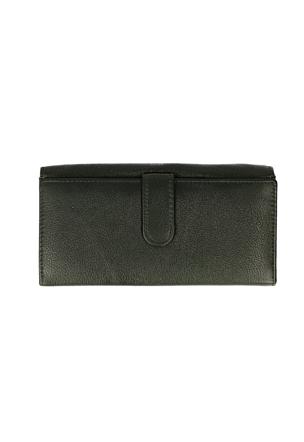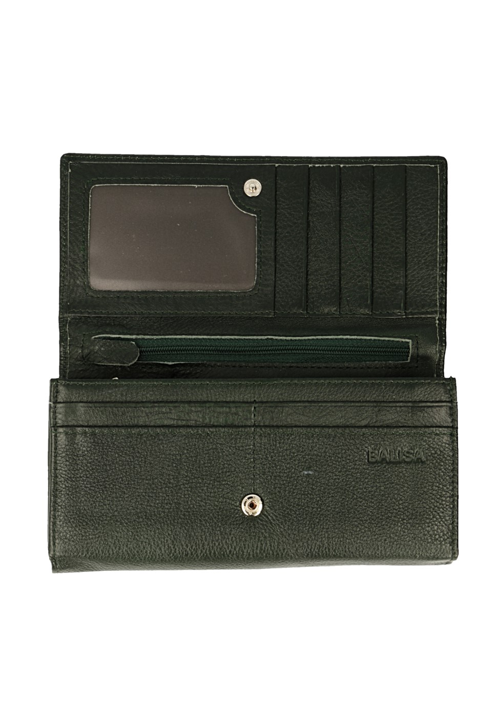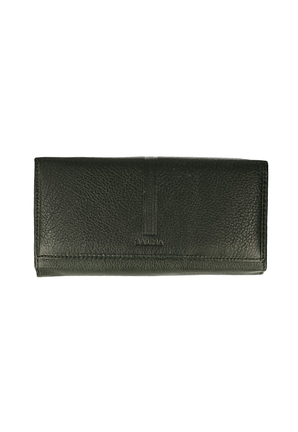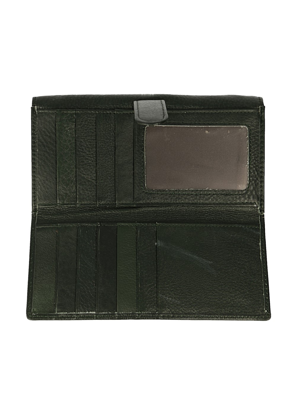 Женский кошелек выполнен из натуральной кожи. Он имеет два отдела: в переднем отделении- четыре отделения для купюр, девять слотов для пластиковых карт, один открытый карман, три кармана на молнии для монет; во втором отделе одиннадцать слотов для пластиковых карт и два открытых кармана. Закрывается на кнопку.
